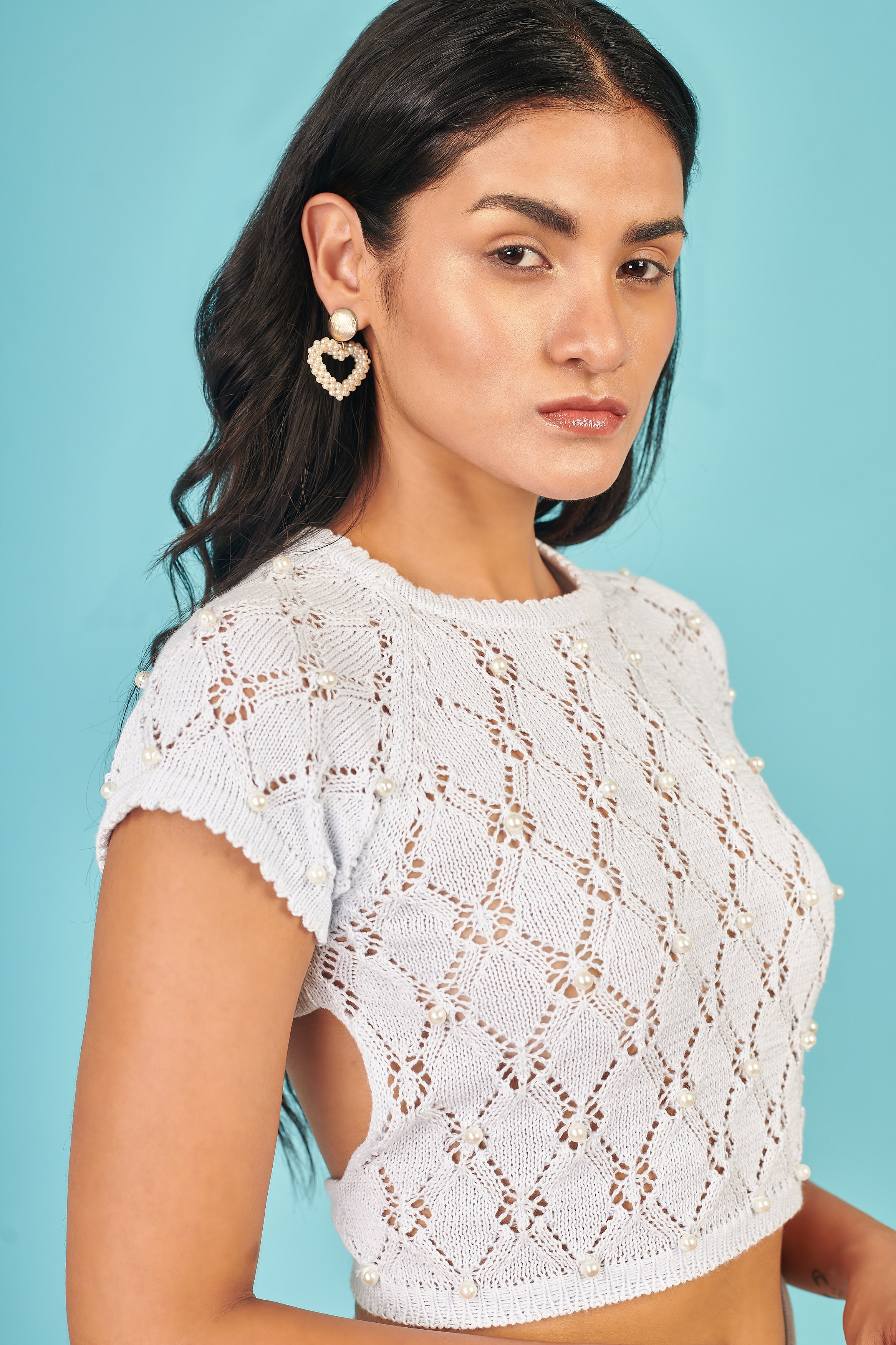 Intervención manual a base de fibra de algodón. Incluye perlas satinadas.Cada puntada de esta pieza ha sido cuidadosamente tejida con mucho detalle y precisión.